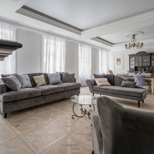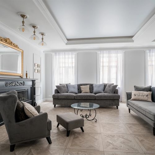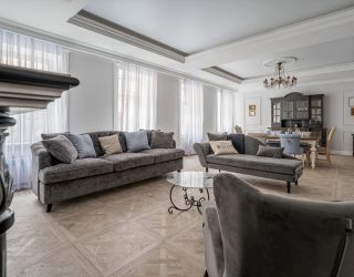 В апартаментах сохранены оригинальные архитектурные и декоративные элементы прошлого, которые гармонично сочетаются с современными эклектичными деталями. Площадь составляет 110 квадратных метров. Есть 2 отдельных санузла, кровать размера King Size, камин, кондиционер, телевизор Smart TV, а также свежее белье, полотенца, тапочки, базовая банная косметика, халаты. К услугам гостей Wi-Fi, вся необходимая техника для комфортной жизни, включая утюг и посудомоечную машину. В апартаментах есть просторная кухня с полным набором кухонной утвари и посуды, а также кофемашиной.
